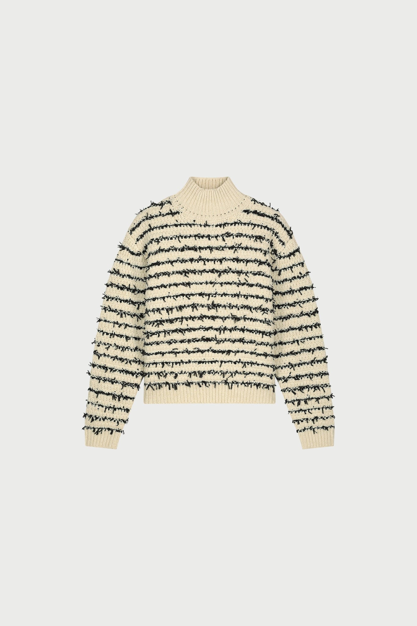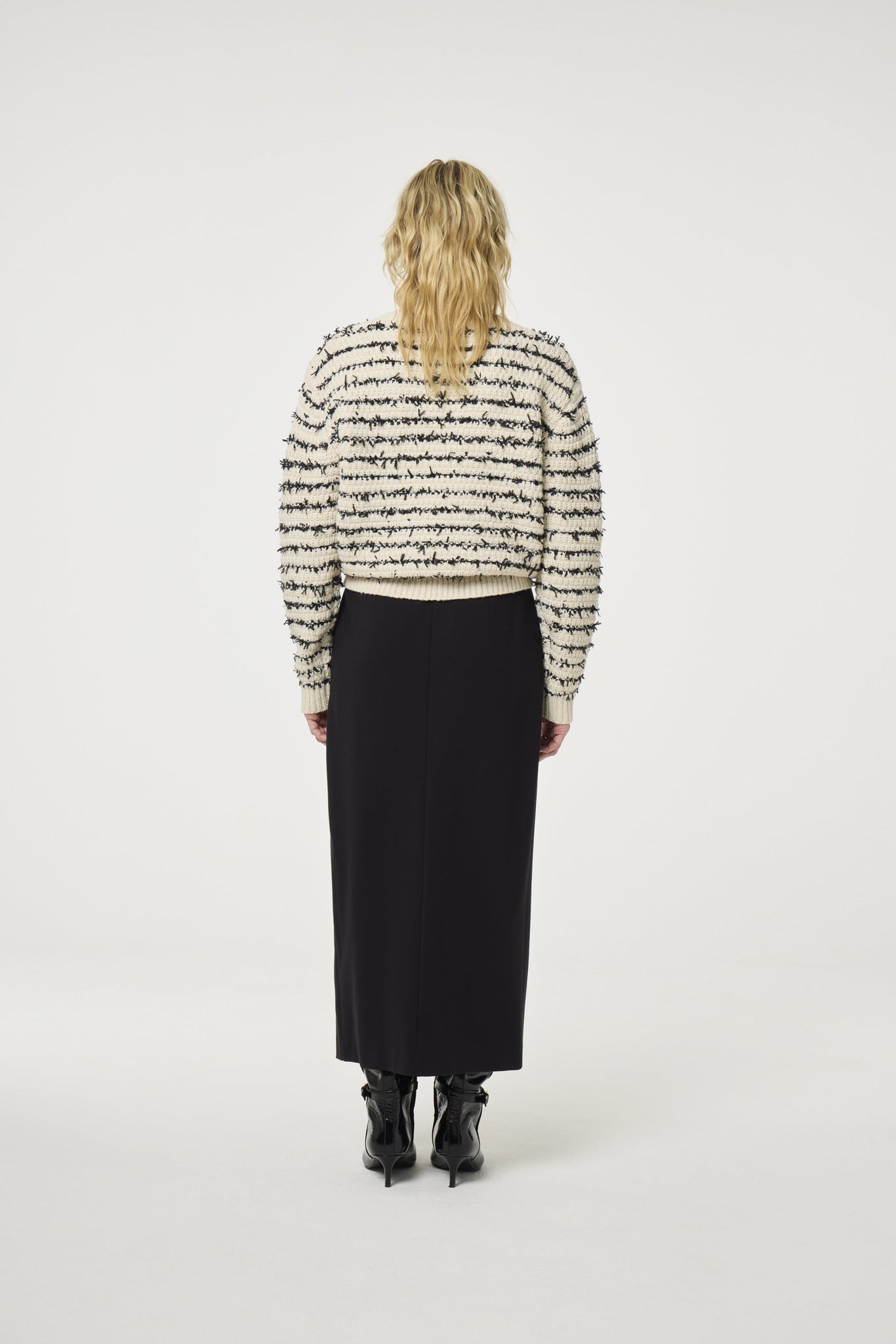 This pullover in cosy white combines a playful textured stripe with a timeless silhouette, creating a piece that is both distinctive and versatile. Dress it down for an easy, relaxed mood or style it with sharper pieces for a look that feels polished yet modern.