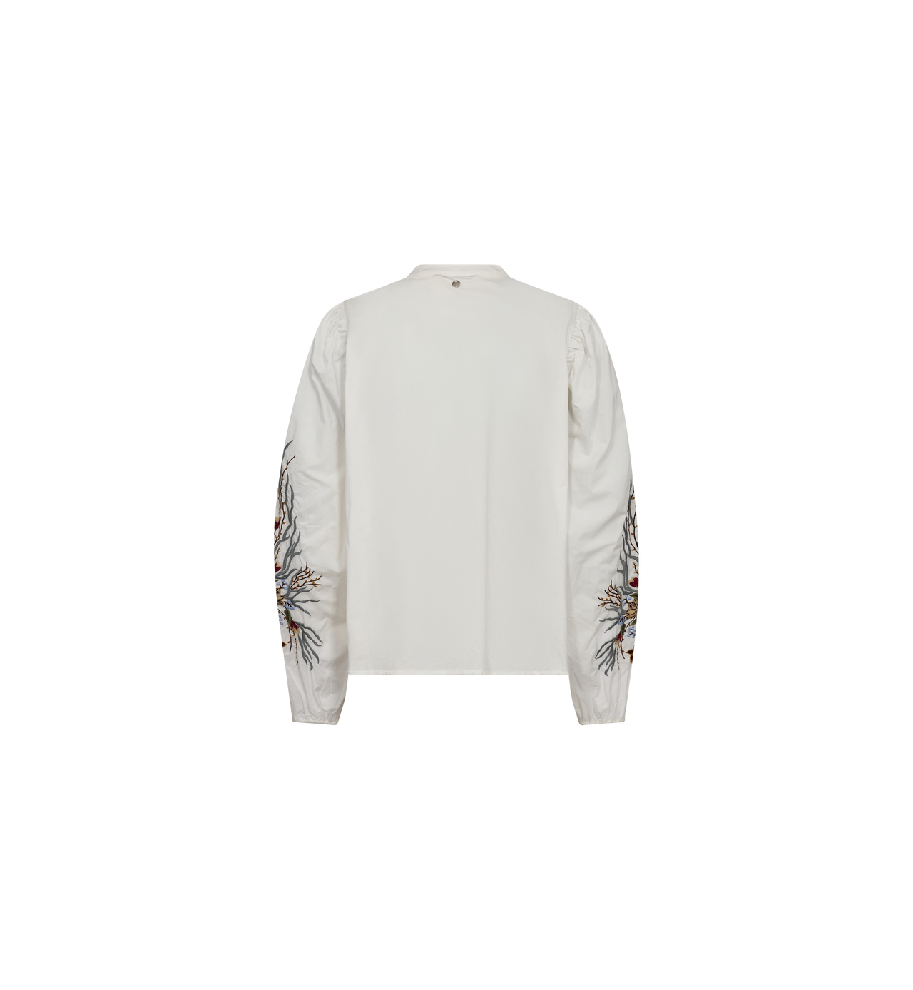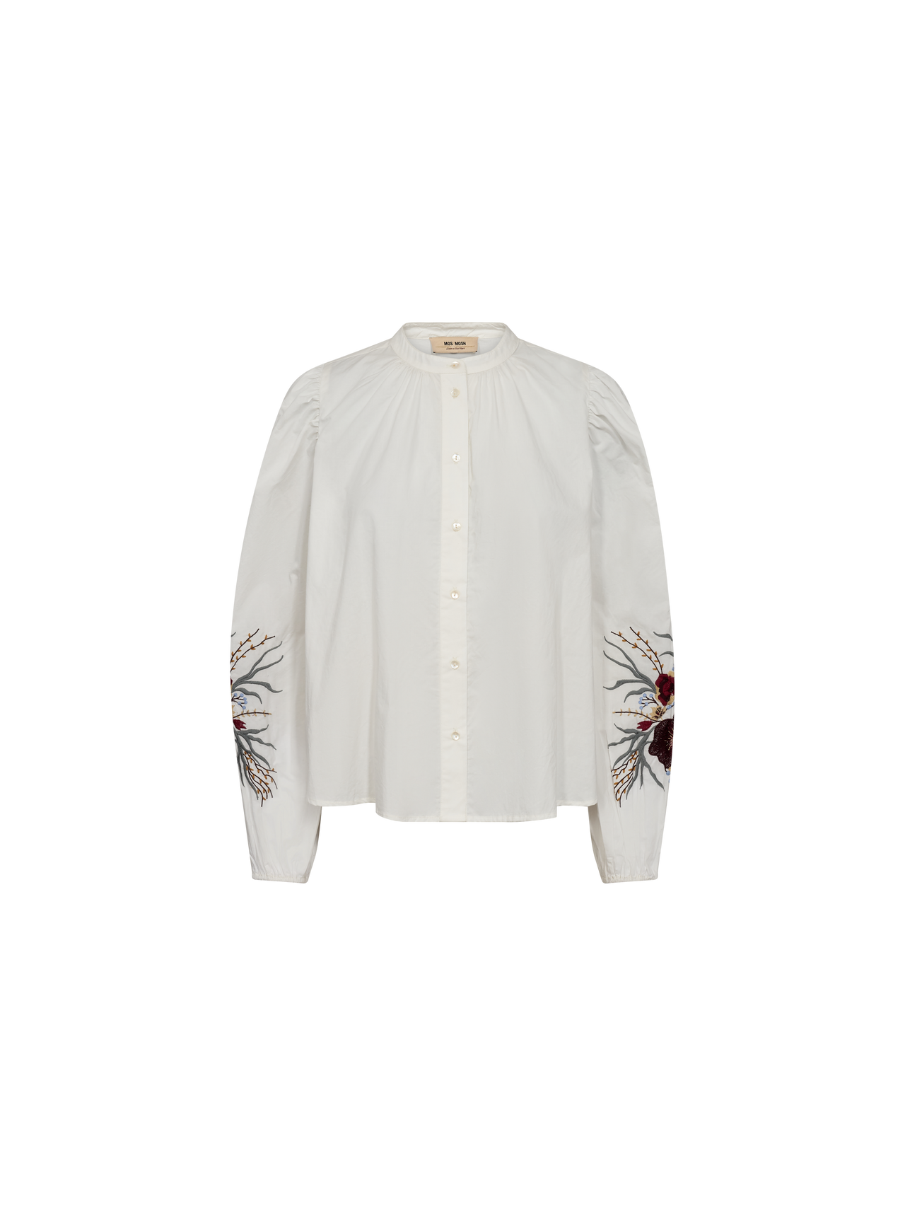 This elegant shirt is designed in a regular fit, featuring a sleek mandarin collar and subtle pleat details for a sophisticated touch. The elasticated cuffs add a refined volume to the sleeves, beautifully highlighting the intricate and colourful floral embroidery. Pair it with tailored trousers for a chic ensemble or style it with denim for a relaxed yet polished everyday look.