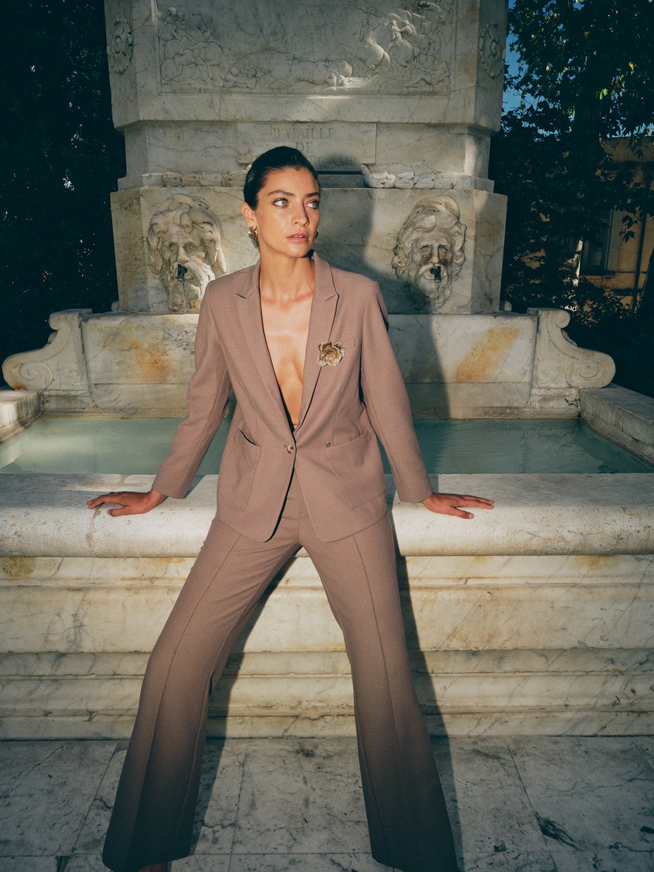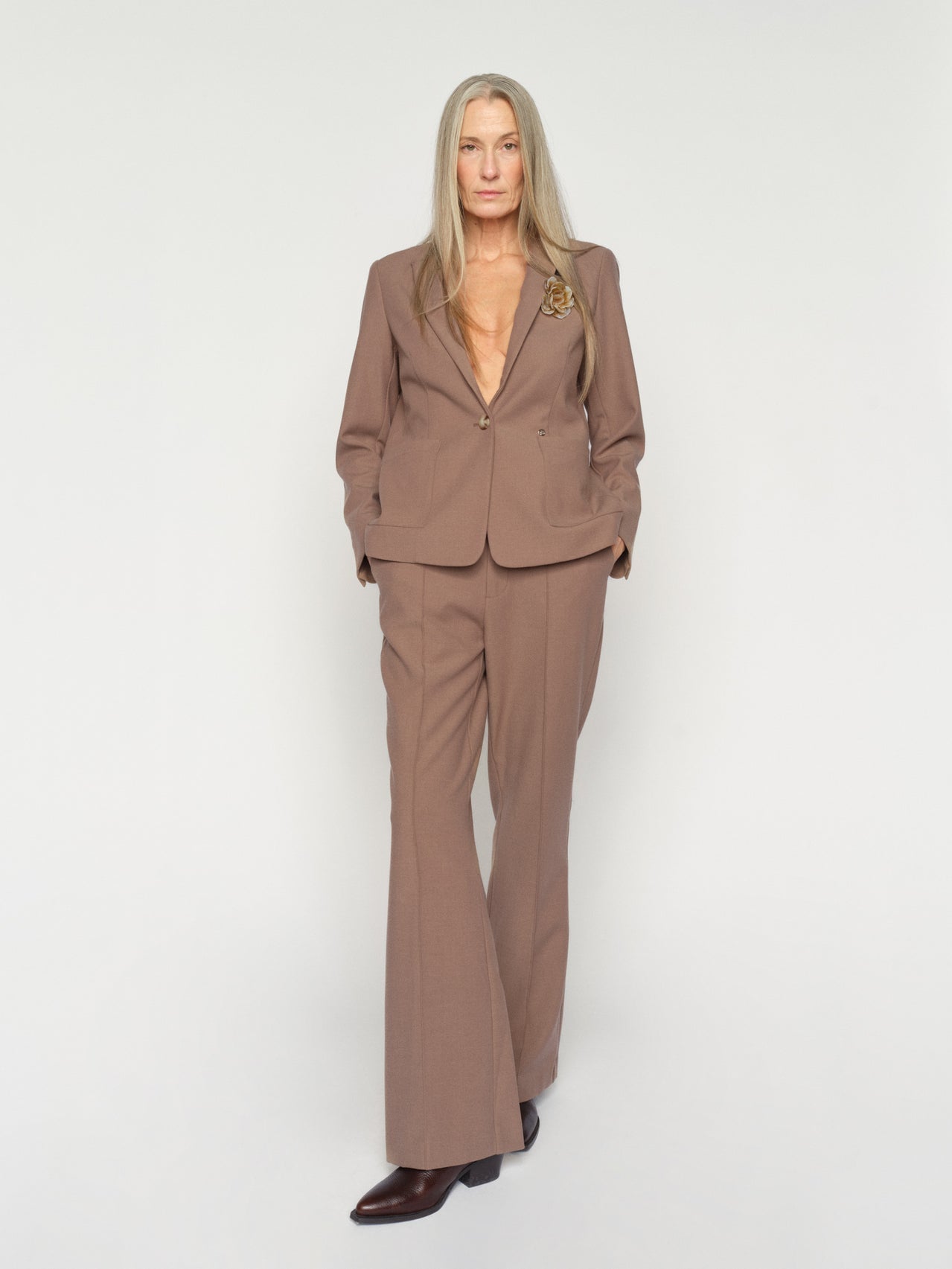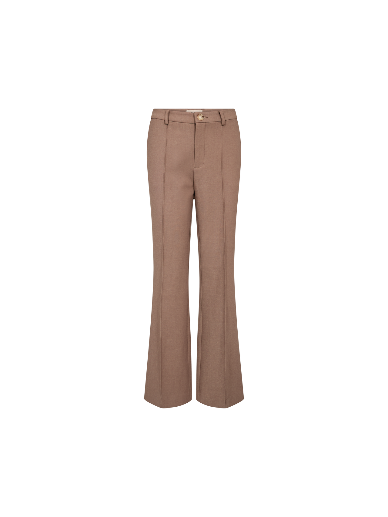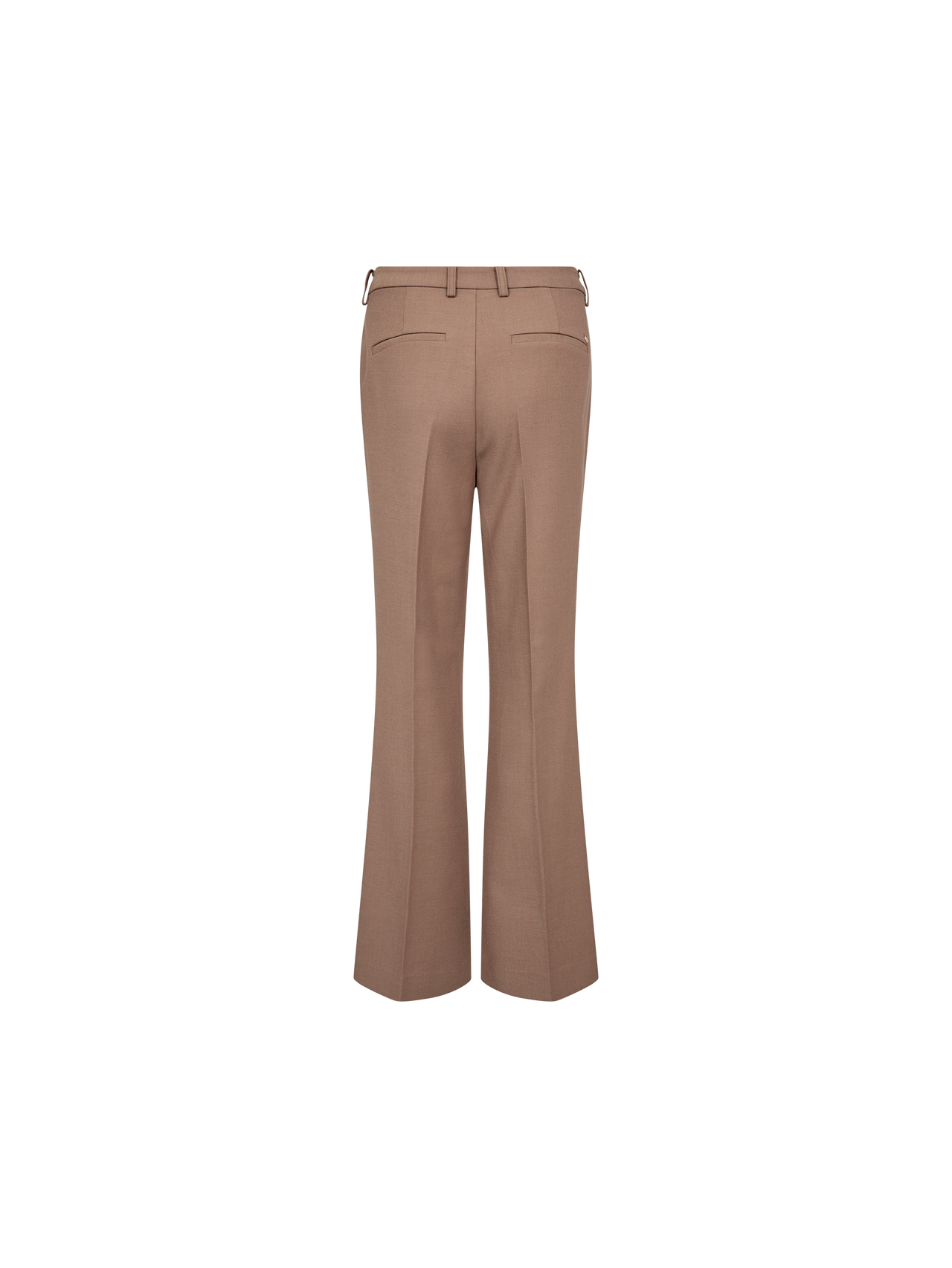 These tailored pants are designed in a flattering mid-rise fit with subtle flare at the hem for a timeless silhouette. They feature pressed creases, side pockets, and back welt pockets for a sophisticated touch. The soft melange fabric adds texture and comfort, making them perfect for both work and everyday styling.