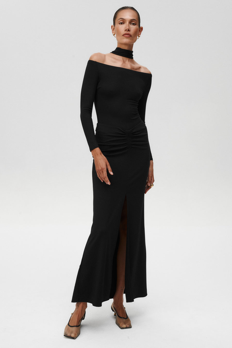 The ultimate, refined elegance with a subtly rounded, asymetric neckline that beautifully exposes the shoulder and turtleneck for the 90's glamorous look. Just put it on and you'll find yourself on a theatre date, or even on some midnight drinks.