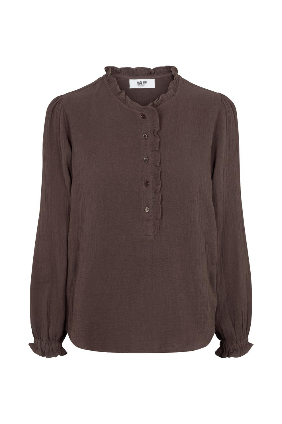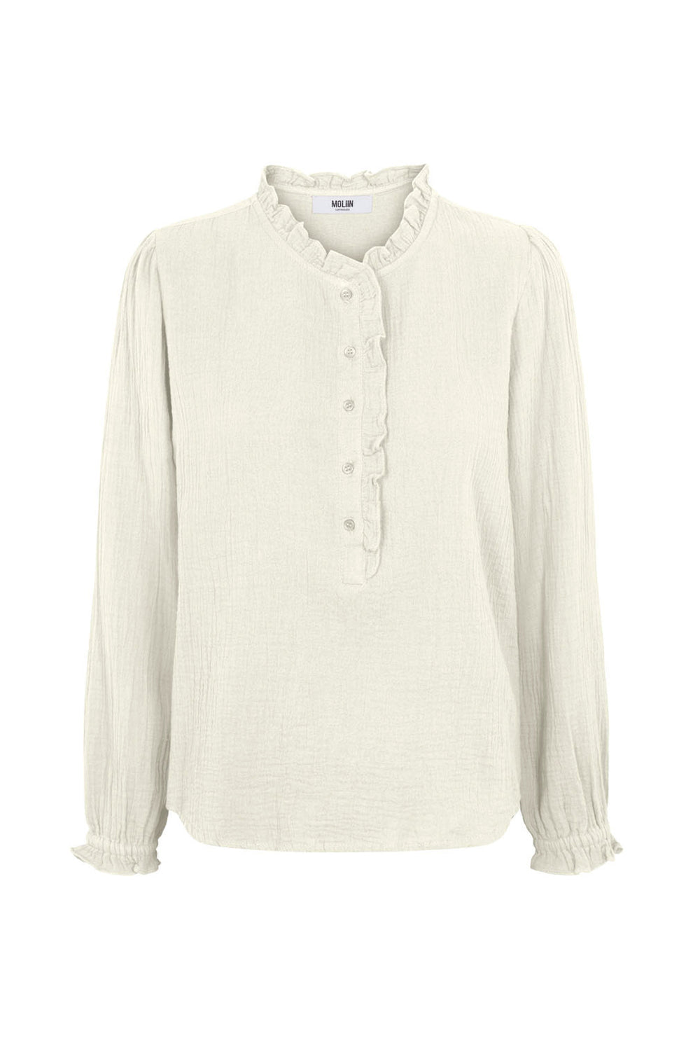 Waffle cotton shirt in soft quality with ruffles along stand collar, placket and cuffs. The placket has button closure.