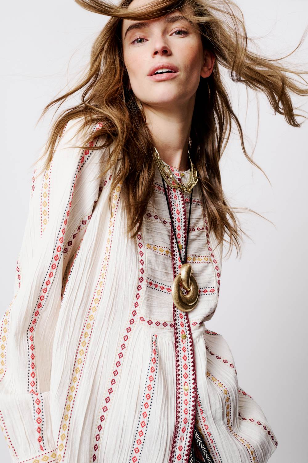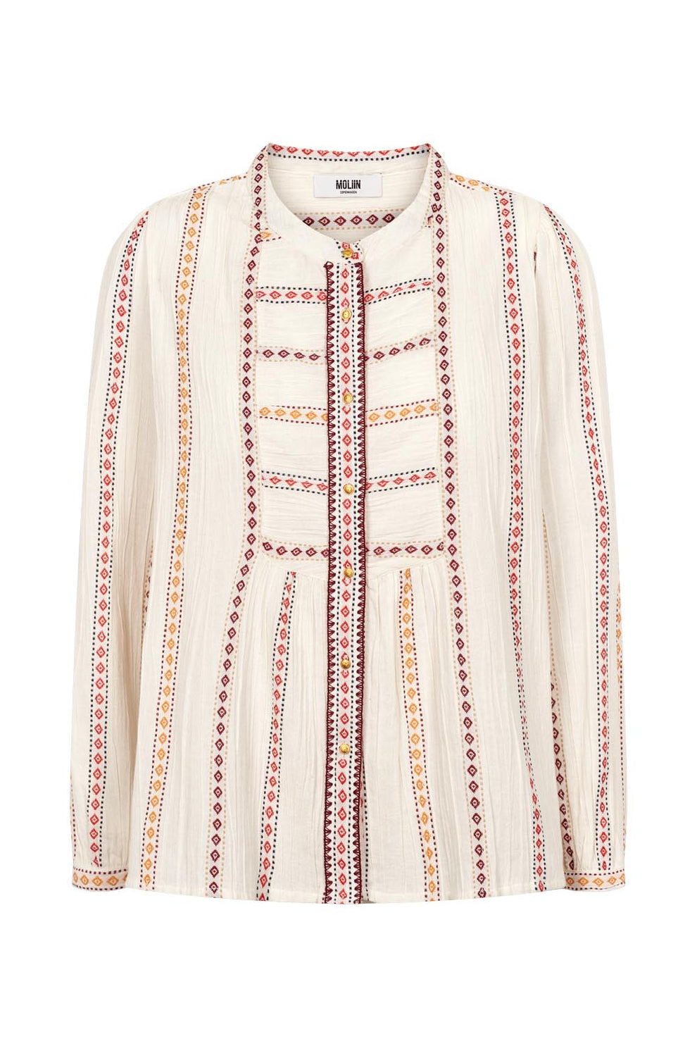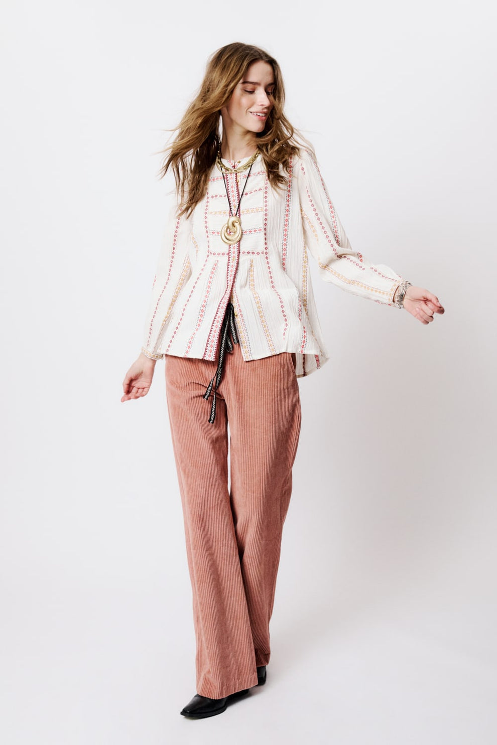 Shirt with a folk inspired striped pattern of embroidered trims in warm tones. The shirt has a round neckline and gold buttoning at front.