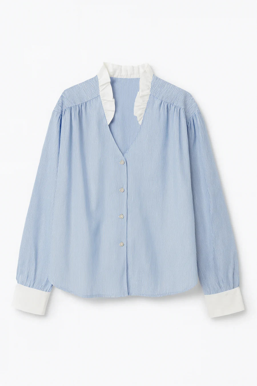 Blouse made from light blue and white fine striped cotton fabric. Collar with white ruffle and contrasting white cuffs, wide and structured. It has a V-neckline, central button placket with pearl buttons and a loose, relaxed fit, with slight gathering at the shoulders for added volume.