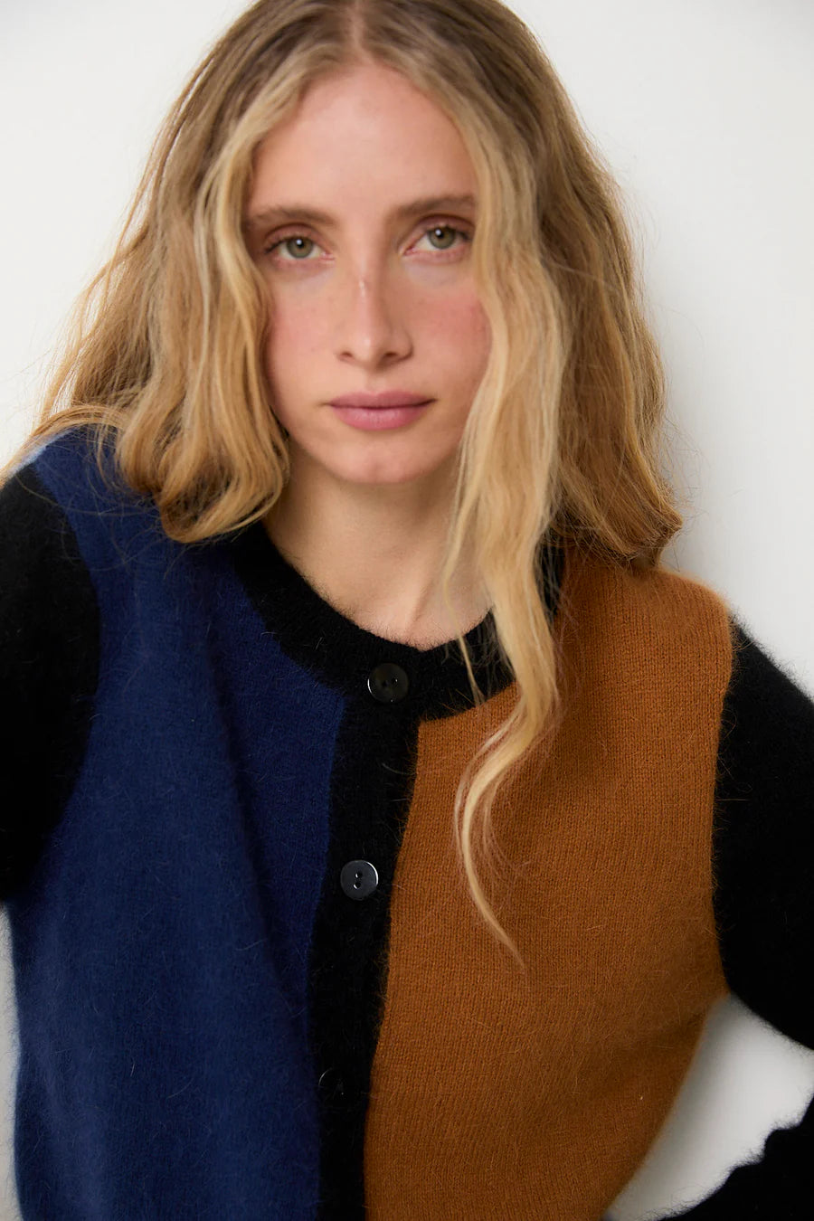 Knitted cardigan with a two-tone design on the front, combined with black sleeves. It features a round neck, a center closure with large buttons, and a soft mohair-like texture
